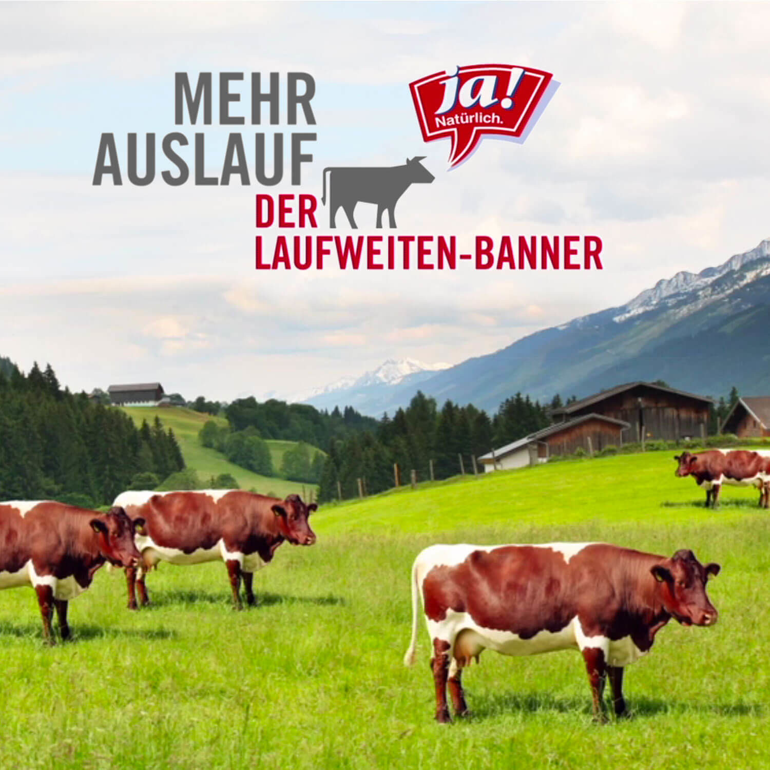 Am Welttierschutztag wurden Banner geschalten, um die Bewegungsfreiheit der Ja! Natürlich-Kühe erlebbar zu machen. Mittels Schieberegler wurde der Auslauf der Kühe durch die Veränderung der Buchstaben-Laufweite im Content dramatisiert.